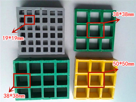 通用型孔徑尺寸,如25mm厚度的玻璃鋼格柵板和38mm厚度的格柵板常規(guī)孔徑均為38mm*38mm。之所以孔徑尺寸為38mm*38mm,是因?yàn)榭紤]到生產(chǎn)原材料的韌性極限與強(qiáng)度范圍。