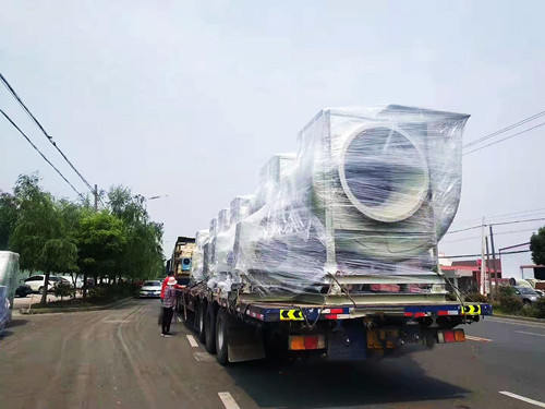 上個(gè)月山東某客戶在我司訂購的一批6臺(tái)14C75KW的玻璃鋼離心風(fēng)機(jī)今天發(fā)貨,之所以交貨期多達(dá)一個(gè)月,主要是因?yàn)檫@一批風(fēng)機(jī)使用的電動(dòng)機(jī)為變頻防爆專用電機(jī),電機(jī)需要進(jìn)行定制。在發(fā)貨前使用透明塑料模對(duì)風(fēng)機(jī)進(jìn)行了整體的包裹。